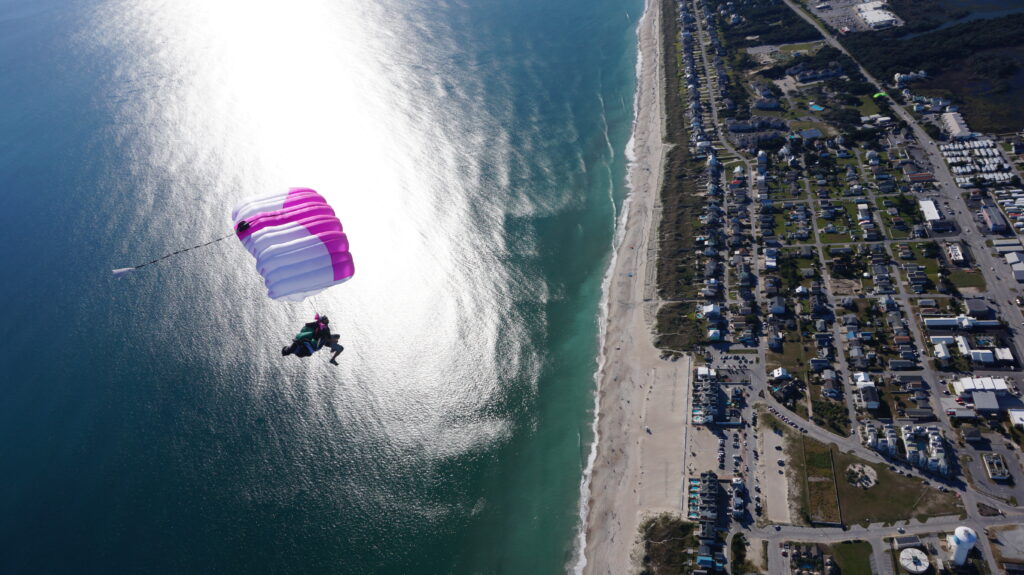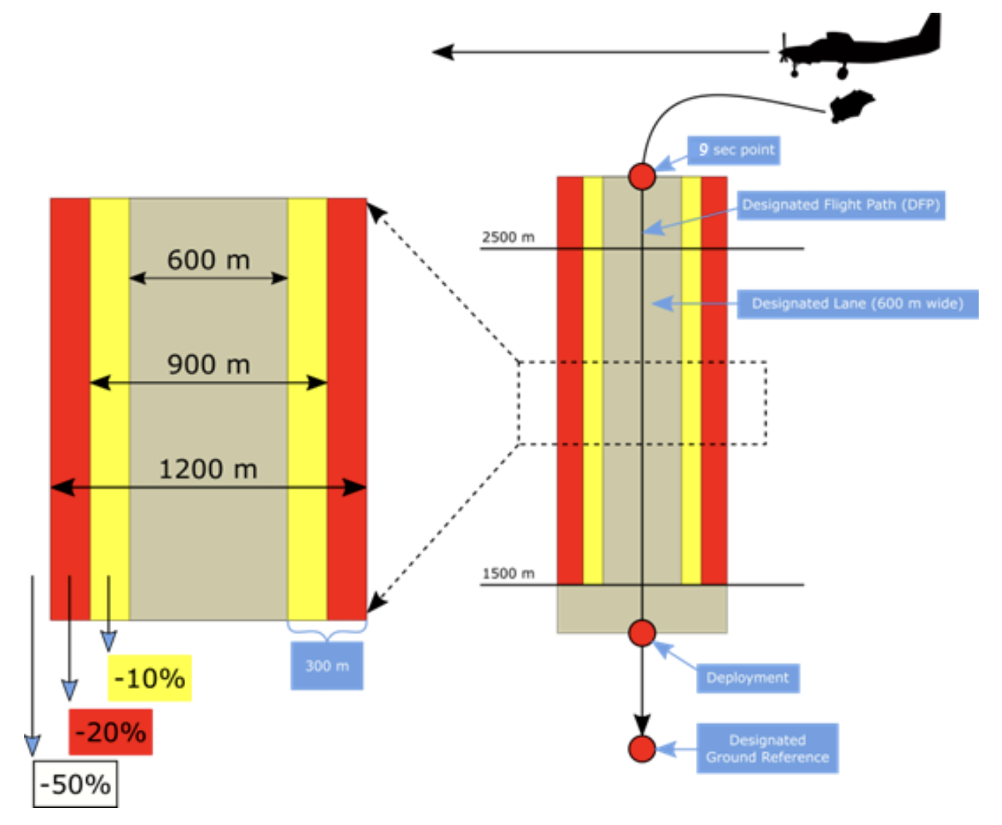 Your lane will be allocated to you by way of a point on the ground being assigned. This assignment will be done with enough time to study the line of flight before boarding and are rotated between jumps. When exiting the plane, this will be the target. The official lane begins 9 seconds after the competitor’s vertical speed first reaches 10m/s and ends 66ft (20m) below the competition window. A straight line from the point at 9 seconds to the point on the ground to designate the lane.