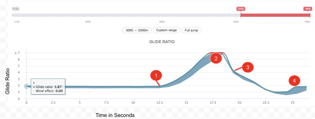 - At Point 1, I am starting my flare at 12.5 seconds (into the selected track data). I hold this flare position for nearly five seconds. As I do, I increase my glide ratio from 1.88 to near 7.17.